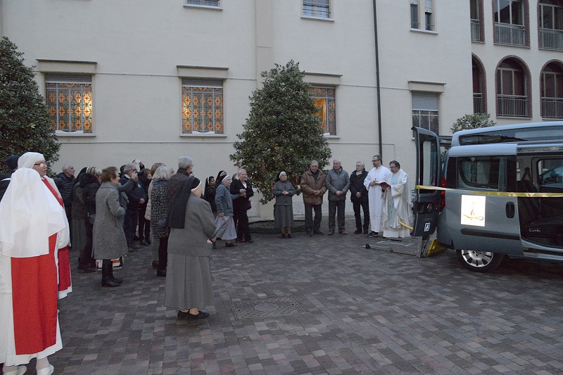 La festa è proseguita con la benedizione del nuovo mezzo di trasporto, un Doblò munito di apposito sollevatore elettrico per le carrozzine, indispensabile per accompagnare le suore anziane e malate nei vari spostamenti. Suor M. Eliodora, Superiora della Casa, ha ringraziato di cuore i tanti amici e benefattori e i Religiosi delle comunità orionine, che con grande solidarietà e generosità hanno contribuito all’acquisto del mezzo.